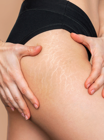 Stretch marks are textured, coloured streaks that develop as the skin stretches beyond its natural elasticity. These marks are often linked to rapid changes in the body, such as weight loss, pregnancy, or growth spurts. The severity of stretch marks in the skin depends on factors like genetics, hormonal changes, and overall skin health.